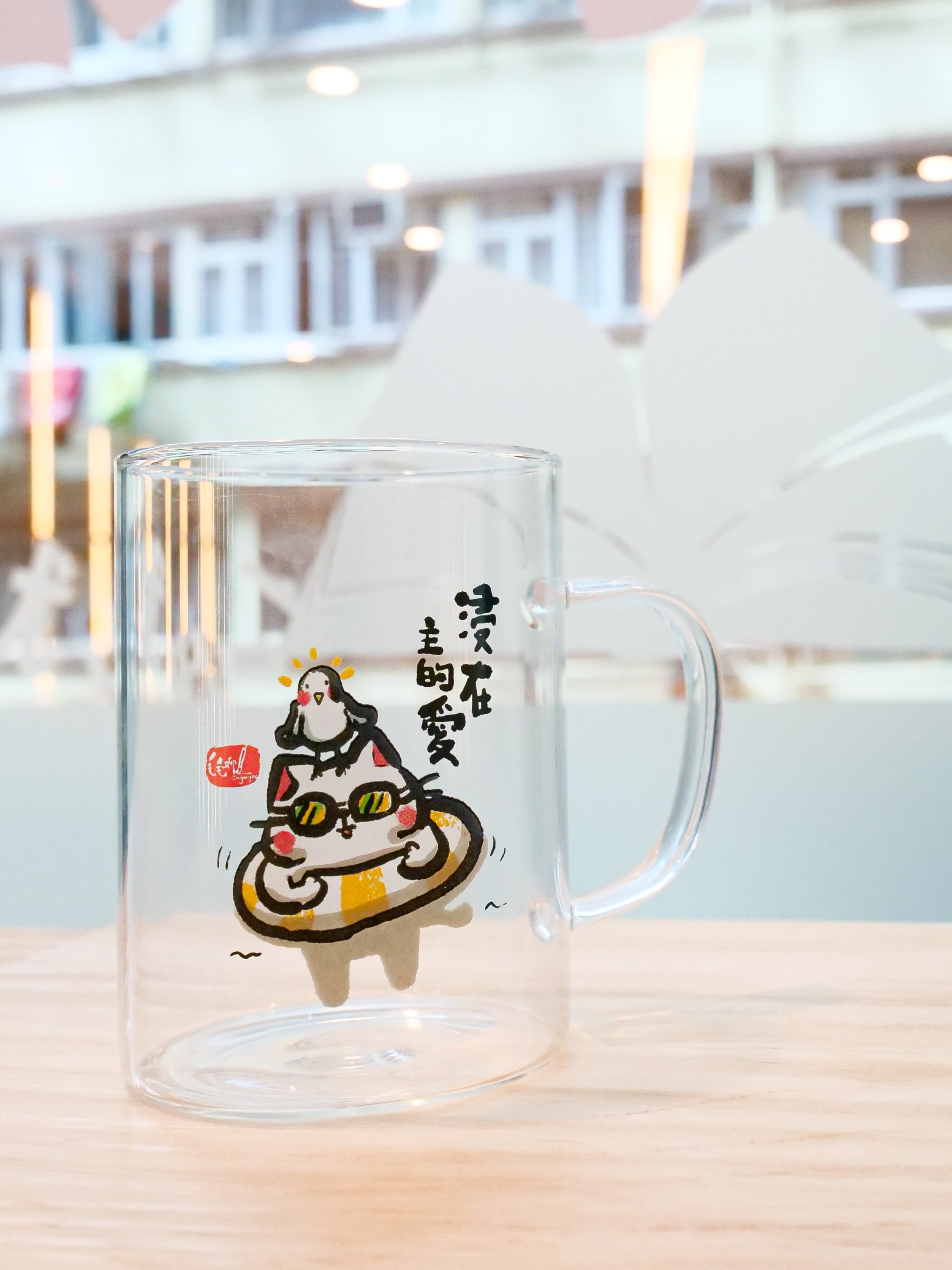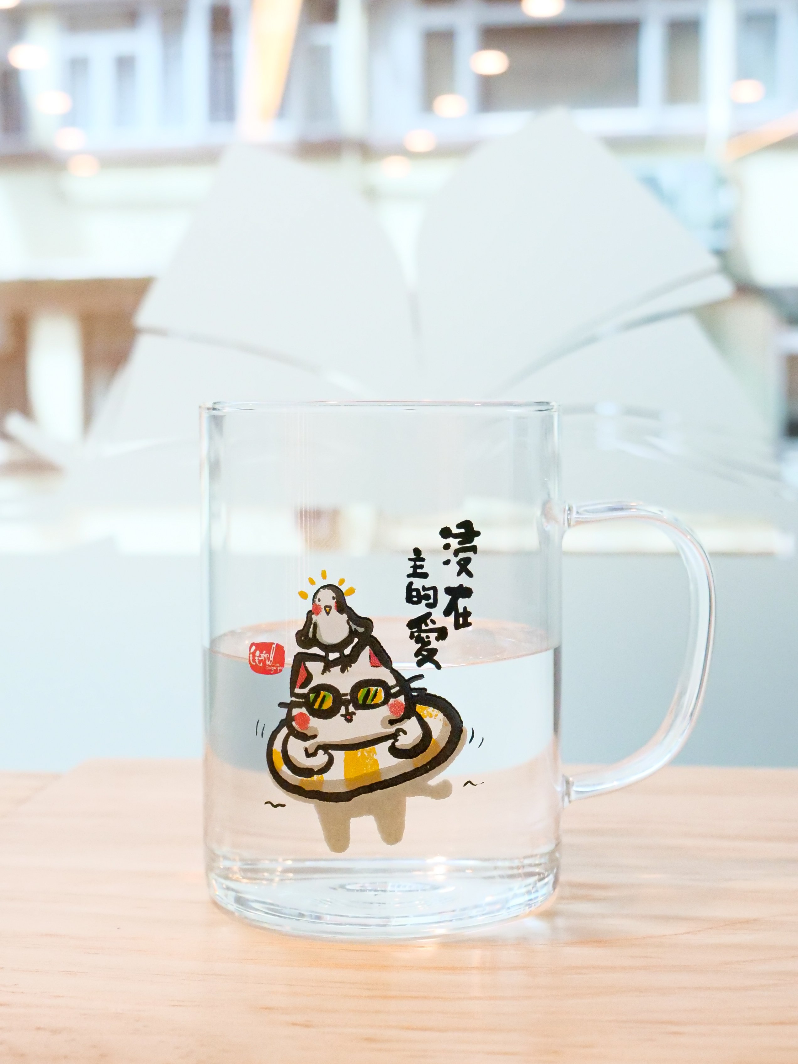 毛毛聊水杯:浸在主的愛 售價:$108 簡介:纖巧的玻璃杯上印有浸在主愛中的貓貓,每當喝水的時刻也想起主愛的浩瀚。 尺寸:110x80mm 產品編號:N0413A